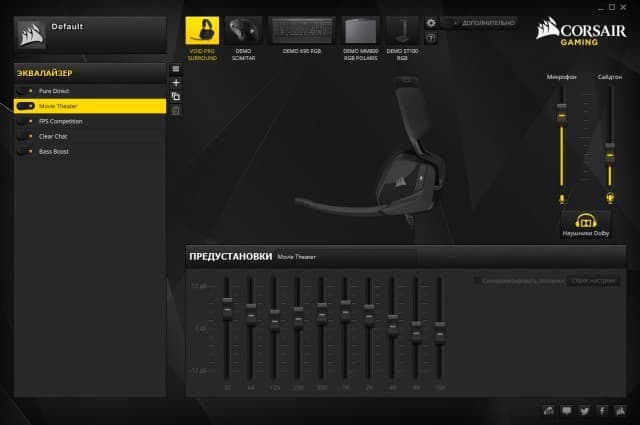 В CUE можно настроить чувствительность микрофона, передачу собственного голоса в наушники и активировать технологию виртуализации многоканального звука.