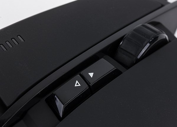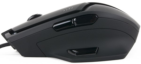Кроме двух дополнительных боковых кнопок, мышь оснащена кнопкой на выступе под большой палец (по умолчанию снайперский режим с уменьшенным разрешением сенсора), заявленный производителем угол которой в 45 градусов представляется несколько меньшим, и двумя кнопками за колесом прокрутки (по умолчанию настройки разрешения сенсора).