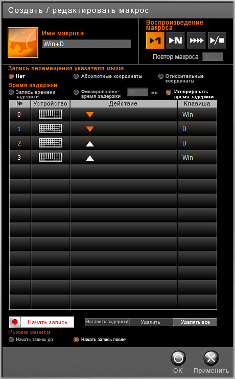 В редакторе макросов можно учитывать позиционирование курсора в абсолютных и относительных координатах, настраивать время задержки между нажатиями и задавать повтор воспроизведения.