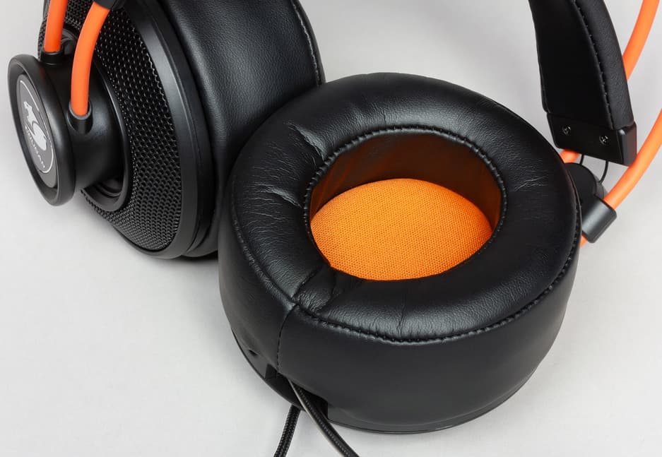 Накладка сделана из кожзама и крепится к оголовью при помощи четырёх тросиков. Тросики вытягиваются и втягиваются обратно, мягко прижимая накладку к голове. На первый взгляд, не самое надёжное решение, однако при детальном рассмотрении тросики оказались весьма прочными. Так что, скорее всего, если проблемы и возникнут, то не с самими тросиками, а с механизмом втягивания-вытягивания. Впрочем, за время тестов следов износа замечено не было. Зато, благодаря такой системе, наушники очень мягко обхватывают голову, что в сочетании с небольшим весом делает их использование чрезвычайно комфортным.