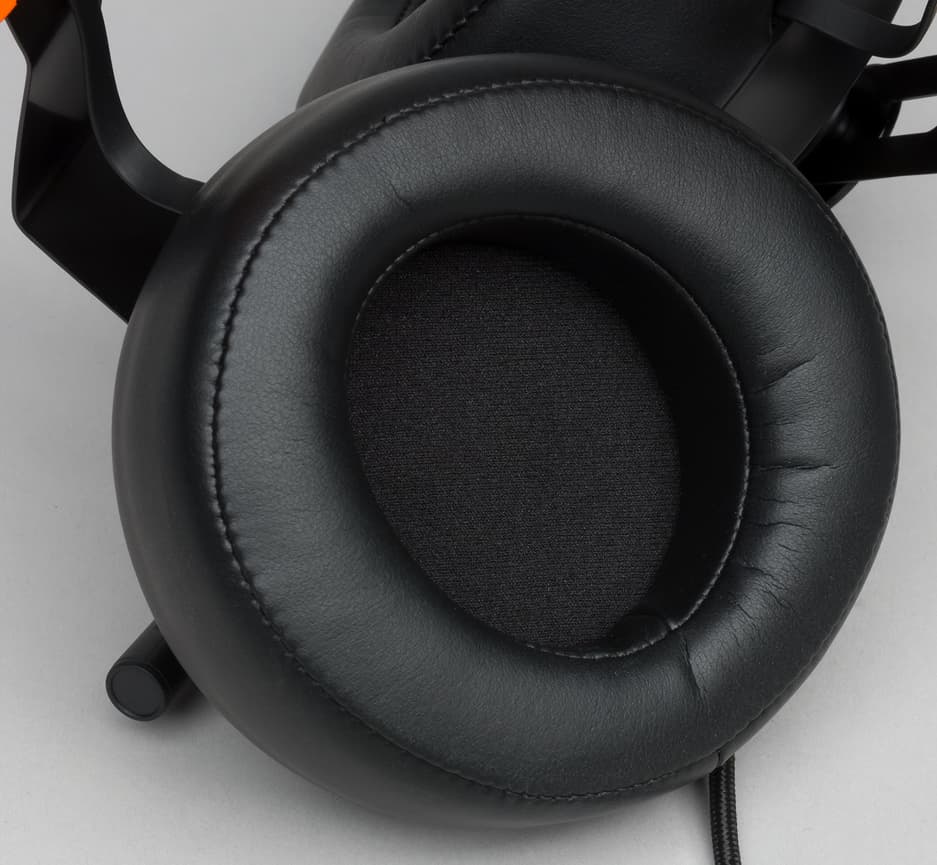 Наушники выполнены из очень качественных и прочных материалов. Сочетание чёрной и оранжевой экокожи, а также металлических декоративных элементов и карбоновой текстуры придаёт наушникам любимую геймерами «агрессивность». Механизм регулировки чашек хорошо продуман — гарнитура подойдёт большинству пользователей. Комплектные амбушюры качественные и обеспечивают весьма комфортную посадку.