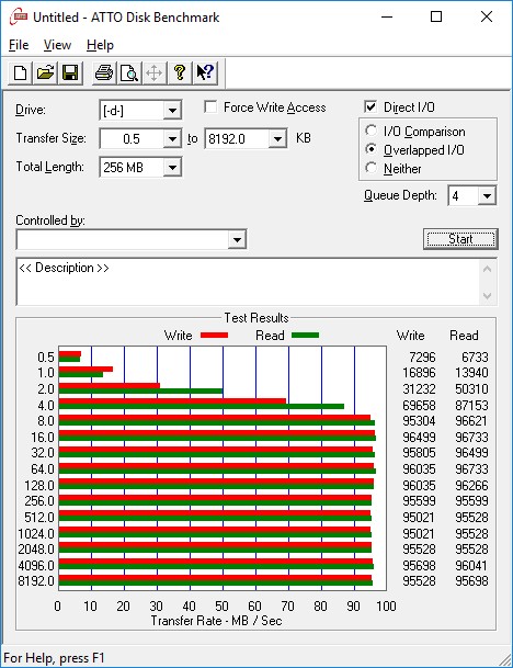 Утилита ATTO Disk Benchmark определяет максимальную скорость последовательного чтения и записи на уровне 95 МБ/с. Ну а что ещё можно ожидать от этого проверенного временем накопителя с интерфейсом SATA-II? Медленно, конечно, зато дёшево.