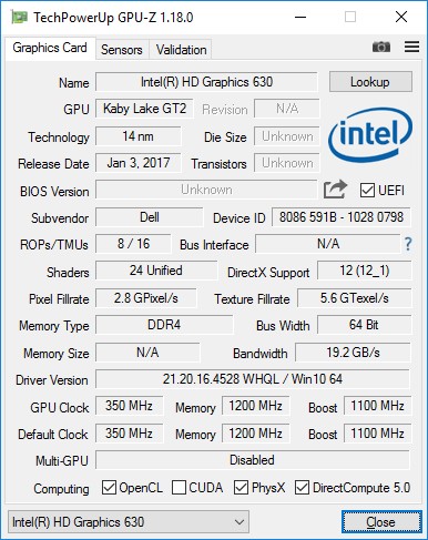 Как выяснилось в ходе тестирования, в режиме стрессовой загрузки (FurMark 1.18.1.0) в установившемся режиме частота GPU составляет 1733 МГц, а частота памяти GDDR5 составляет 1752 МГц. Температура GPU стабилизируется на уровне 62 °С. Напомним, что максимальная частота GPU Nvidia GeForce GTX 1050 Ti в режиме Boost составляет 1620 МГц. Другими словами, в варианте ноутбука Dell Inspiron 15 (7567-8852) видеокарта даже немного разогнана.