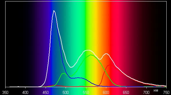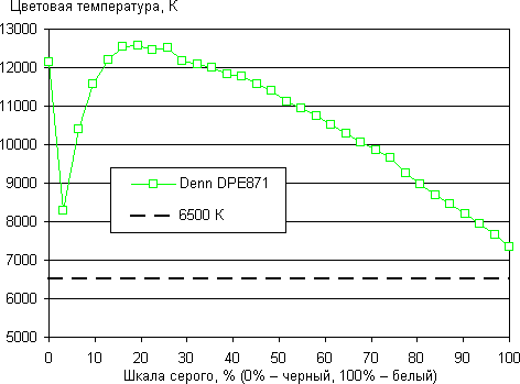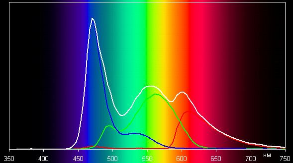 Светофильтры матрицы подмешивают компоненты друг к другу. Данный прием позволяет увеличить яркость экрана при тех же затратах энергии на подсветку. Цветовая температура сильно возрастает при переходе к темным оттенкам (близкий к черному цвету диапазон можно не учитывать, так как в нем цветопередача не так важна, а погрешность измерения цветовых характеристик высокая):