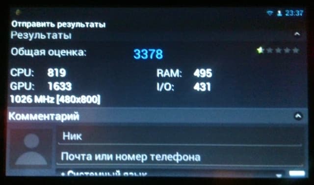 Производитель приукрасил практически все характеристики планшета, поскромничав лишь с разрешением. В Antutu Benchmark наш герой набрал в общей сложности очень скромные 3378 баллов, преимущественно за счет видео, показавшего в два раза лучший результат, чем процессор, и в четыре раза лучший по сравнению с памятью. 356 МБ RAM, по современным мобильным меркам, это очень мало, да и с постоянной памятью, судя по результатам, многого ожидать не приходится.