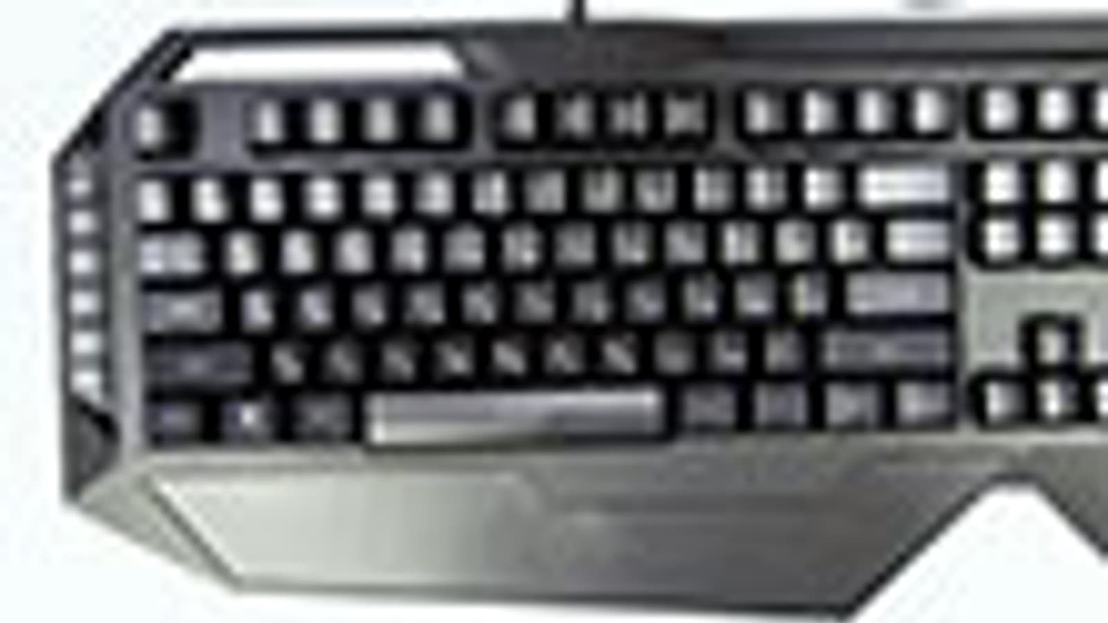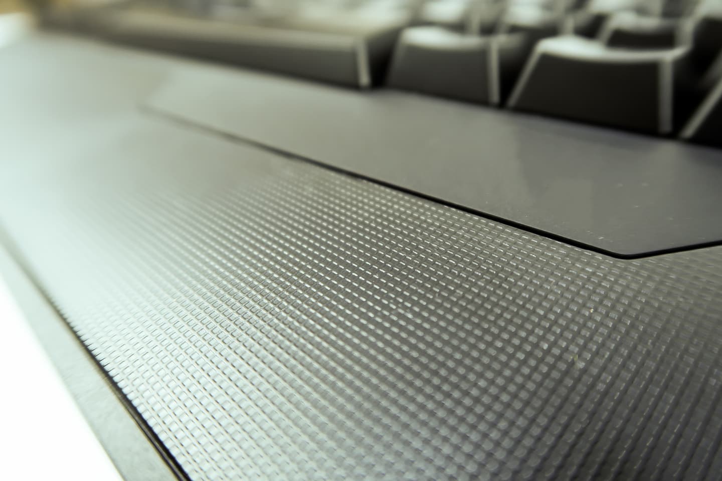 На нижней грани клавиатуры расположена неотсоединяемая эргономичная подставка для рук. Левая часть подставки имеет текстурированную серую вставку, которая, впрочем, является скорее дизайнерским элементом - сцепление с рукой кардинально не увеличивается.
