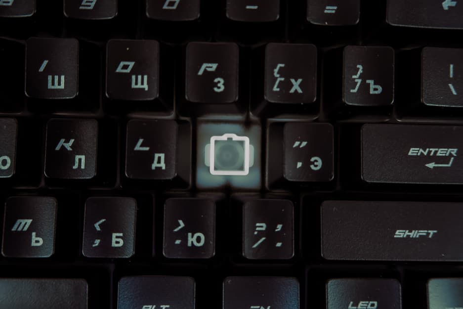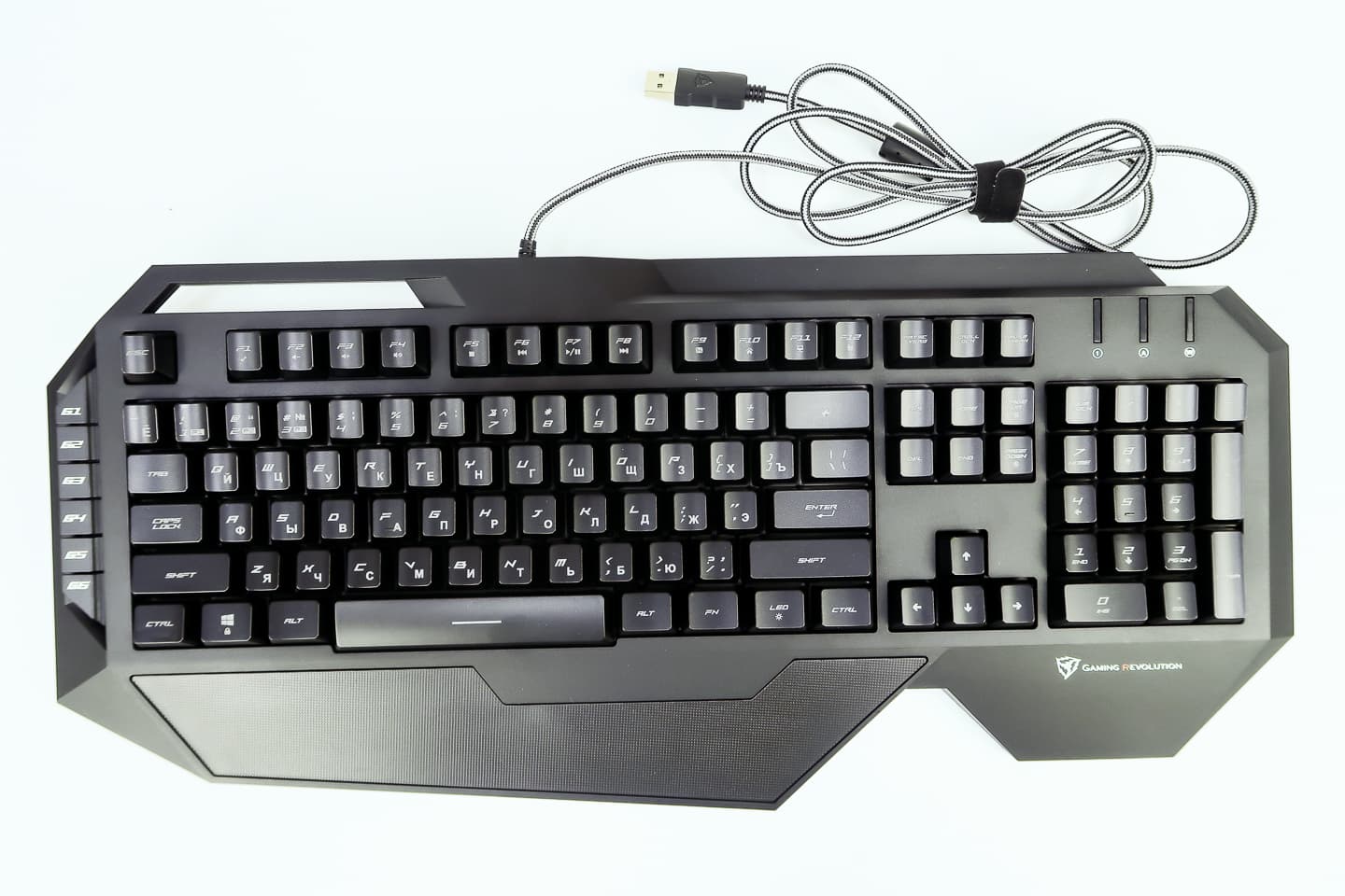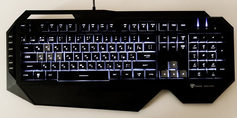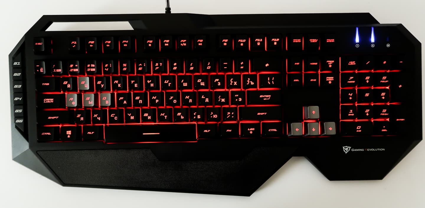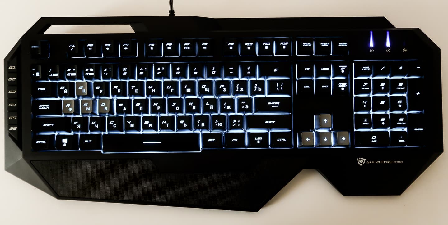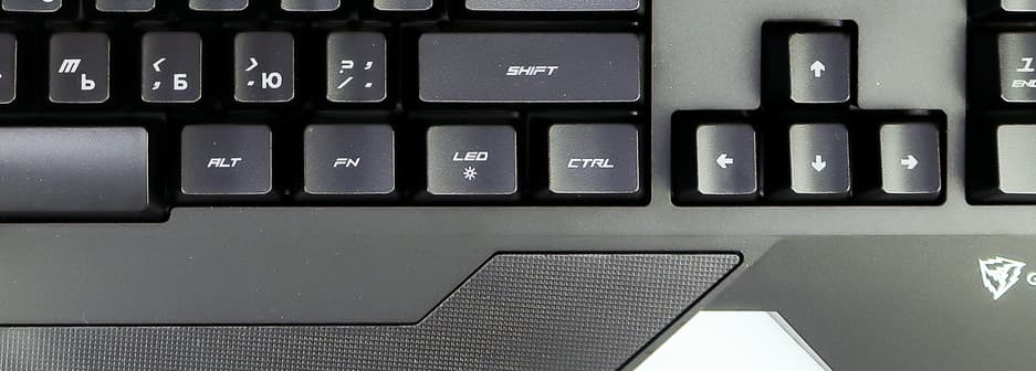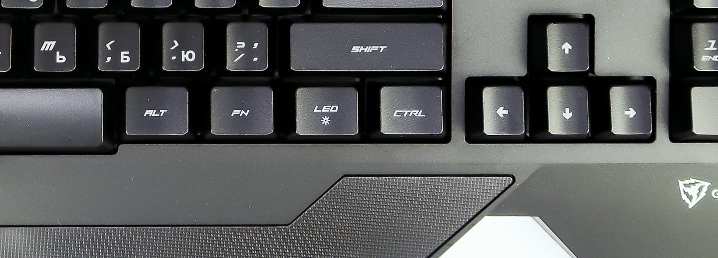 Компоновка клавиш стандартная, за исключением кнопок FN и LED в нижнем ряду. Первая отвечает за клавиатурные сочетания для включения мультимедийных функций, а вторая включает и изменяет цвет подсветки клавиш вне зависимости от того, подключена ли клавиатура к приложению. Также сочетаниями Fn+PageUP\Fn+PageDown можно изменить яркость подсветки.