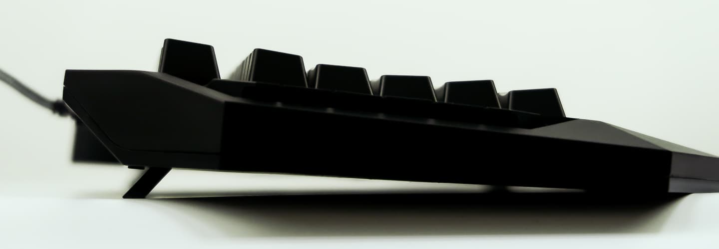 Клавиши имеют достаточно высокий профиль и небольшое углубление под палец. Можно заметить, что производитель использовал оригинальный шрифт - подобное решение, в теории, должно добавить клавиатуре солидности в глазах геймеров. Механизм клавиш - плунжерный. В отличие от стандартных мембранных клавиатур здесь у каждой клавиши имеется собственная силиконовая подложка, выступающая в роли пружины. Это позволяет сделать ход клавиши более плавным и равномерным, однако в работе клавиатура становится несколько более шумной, а характеристики срабатывания клавиши остаются неизменными - нажатие фиксируется в конце хода. Также силиконовый механизм выступает в роли рассеивателя для подсветки.
