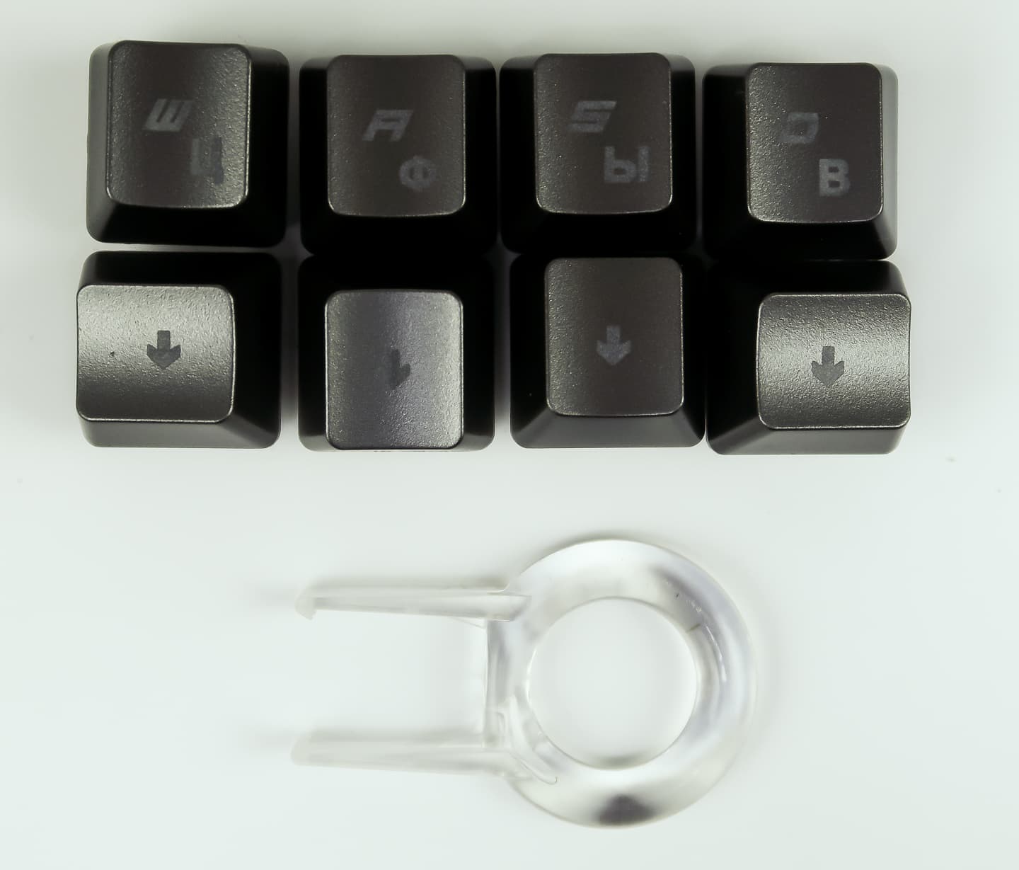 В комплекте, кроме самой клавиатуры, находится полупрозрачный экструдер для клавиш и сменные клавиши (группа WASD и стрелки) серого цвета.