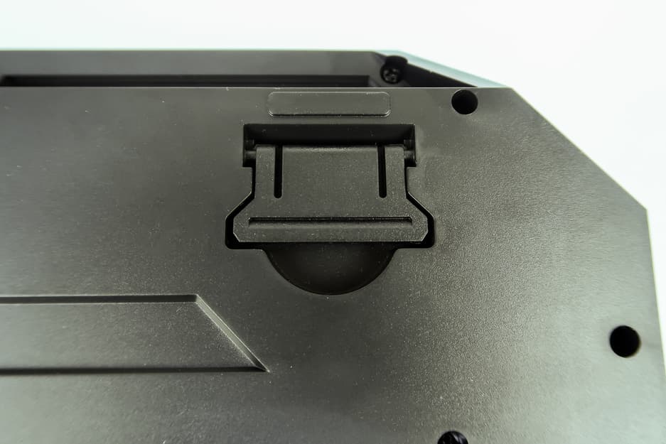 В верхней части находятся откидные ножки для смены угла наклона клавиатуры. Каждая ножка также снабжена резиновой текстурированной вставкой. В любом из вариантов клавиатура уверенно стоит на столе и не сдвигается при работе.