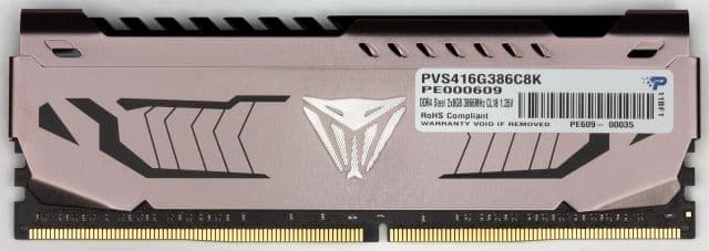 Семейство Patriot Viper Steel включает в себя как отдельные модули DDR4-3000 на 8 ГБ, так и комплекты из двух модулей общей ёмкостью 16 ГБ, рассчитанные на частоты 3200, 3866, 4000, 4133 и 4400 МГц. Вариант с 4400 МГц появился только в декабре 2018 года, а достигаются такие рабочие частоты при напряжении 1,45 В и с задержками CL19-19-19. Такое напряжение достаточно далеко от штатных для DDR4 1,2 В, и подобный режим «потянет» не каждая система. Поэтому мы ограничились комплектом PVS416G386C8K со штатной частотой 3866 МГц, зато достижимой при 1,35 В.