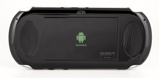 На тыльной стороне размещена пара текстурированных поверхностей для того, чтобы консоль не выскальзывала из рук. Посередине — логотип Android и, к cчастью, точно над ним — тыловая камера.