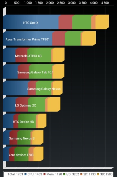 Quadrant Benchmark был первым в ряду тестов. Общие результаты практически совпадают с Samsung Nexus S.
