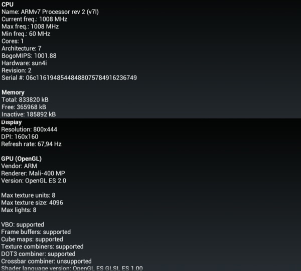 Мы определили, что в игровом планшете установлен процессор Allwinner (Boxchip) A10. Согласно спецификациям, его частота составляет 1,5 Гц; в действительности он, по-видимому, работает на 1,2 ГГц. Antutu и Quadrant Benchmark и вовсе рапортуют об 1 ГГц. В целом очень многие планшеты имеют в точности такую же начинку; выделим среди них iconBIT NetTAB Matrix, который был подробно рассмотрен в мае. «Титанические» характеристики же таковы: