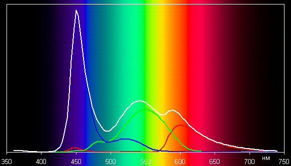 Видимо, светофильтры матрицы немного подмешивают компоненты друг к другу. Данный прием позволяет увеличить яркость экрана при тех же затратах энергии на подсветку. Цветовая температура сильно возрастает при переходе к темным оттенкам (близкий к черному цвету диапазон можно не учитывать, так как в нем цветопередача не так важна, а погрешность измерения цветовых характеристик высокая):