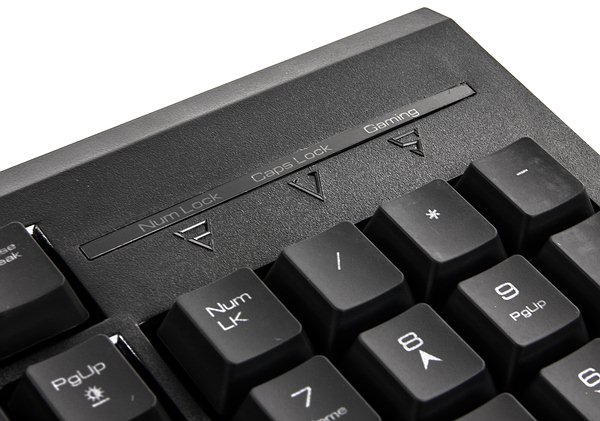 Одиночные красные светодиодные индикаторы, сигнализирующие о режимах Num Lock, Caps Lock и Gaming (отключение Windows-кнопки, активируется сочетанием Fn+F12), скрыты за полупрозрачной вставкой с соответствующими надписями, информация о режиме Scroll Lock не отображается.