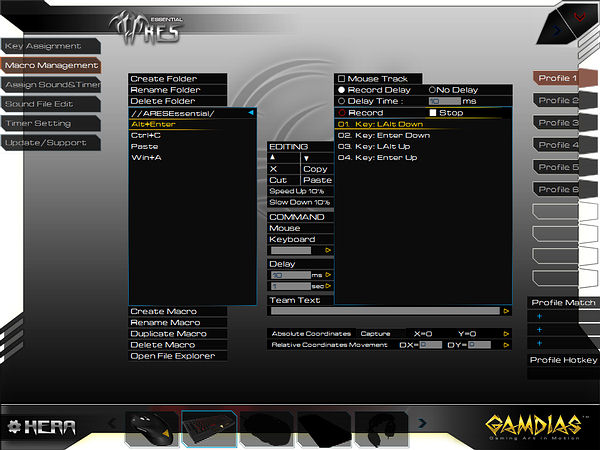 GAMDIAS Ares Essential не имеет встроенной памяти, поэтому все дополнительные возможности требуют обязательного запуска программы HERA.