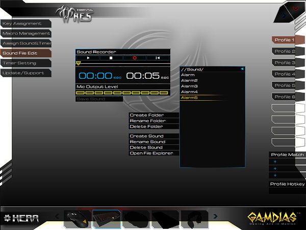 Любопытной возможностью ПО от GAMDIAS является доступное в разделе «Assign Sound&Timer» назначение на любую кнопку однократного или продолжительного воспроизведения звуковых файлов или таймеров, опциональны перезапуск и прерывания по однократному и двукратному нажатиям.