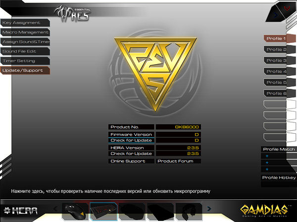 GAMDIAS Ares Essential не поддерживает обновление прошивок, поэтому к возможностям вкладки «Update/Support» имеет смысл прибегать только для проверки обновления самой программы.