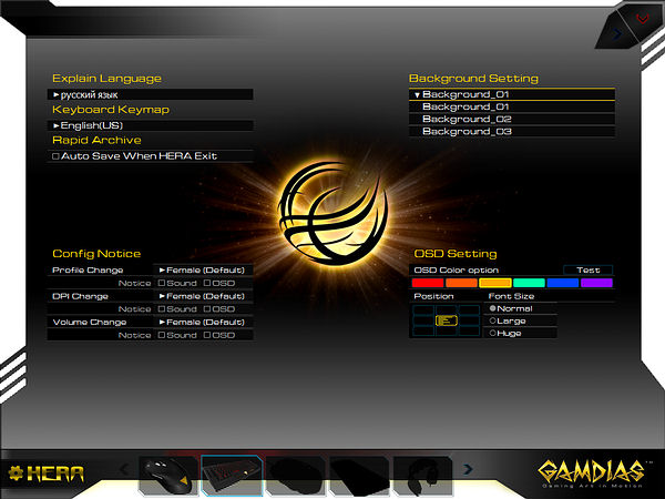 Нажатие на надпись «HERA» в левом нижнем углу основного окна программы вызывает дополнительные настройки, позволяющие выбрать фон интерфейса, раскладку клавиатуры, язык текстовых подсказок (русский поддерживается, но сами настройки в любом случае остаются на английском), включить экранные и голосовые (мужским или женским голосом на выбор) подсказки при переключениях профиля, изменениях громкости и разрешения сенсоров мышей от GAMDIAS при их наличии.
