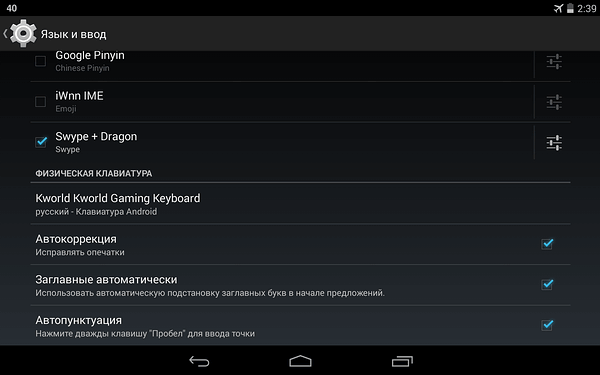 При подключении к планшету ASUS Nexus 7 2013 (версия Android 4.4.2) через OTG-кабель GAMDIAS Hermes не стыдится демонстрировать свое происхождение, определяясь как Kworld Kworld Gaming Keyboard.