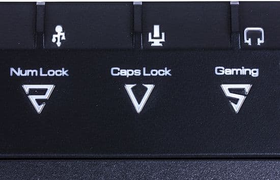 Красные светодиодные индикаторы, выдержанные в общем псевдогреческом стиле, сигнализируют о режимах Num Lock и Caps Lock, информация о режиме Scroll Lock не отображается, третий индикатор отвечает за режим Gaming (активируется сочетанием Fn+F12), отключающий Windows-кнопку.