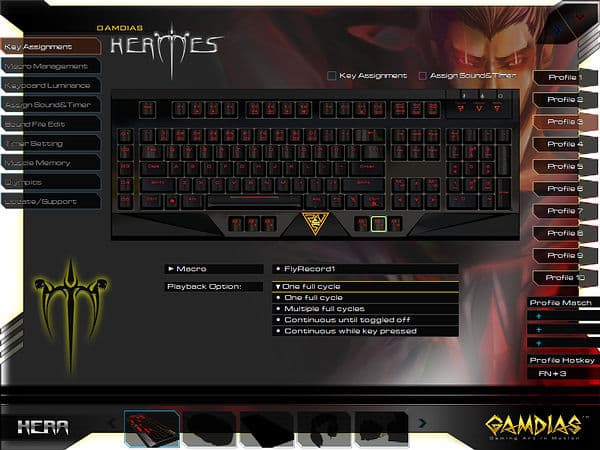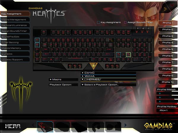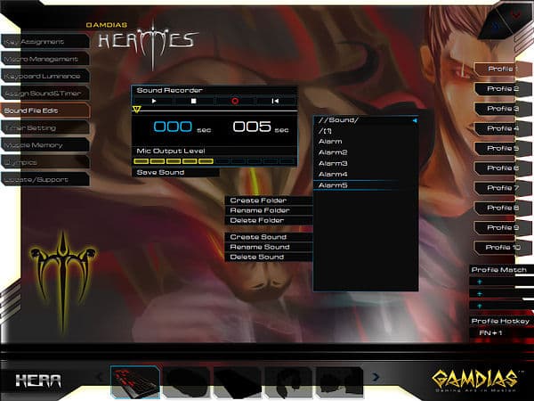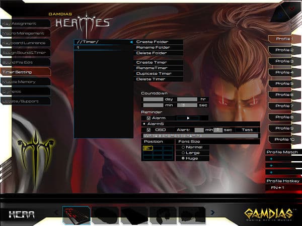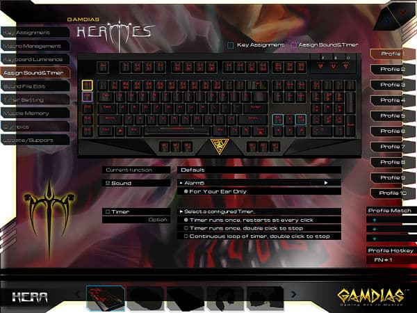 Любопытной возможностью ПО от GAMDIAS является доступное в разделе «Assign Sound&Timer» назначение на любую кнопку однократного или продолжительного воспроизведения звуковых файлов или таймеров (также требует запуска HERA), опциональны перезапуск и прерывания по однократному и двукратному нажатиям.