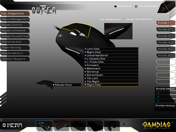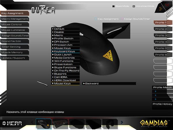 Первая вкладка продвинутого режима позволяет настроить кнопки для каждого из шести профилей (пустые слоты являются побочным эффектом унификации ПО, в частности, GAMDIAS Hermes поддерживает 10 профилей).