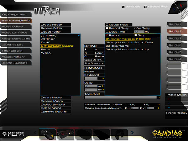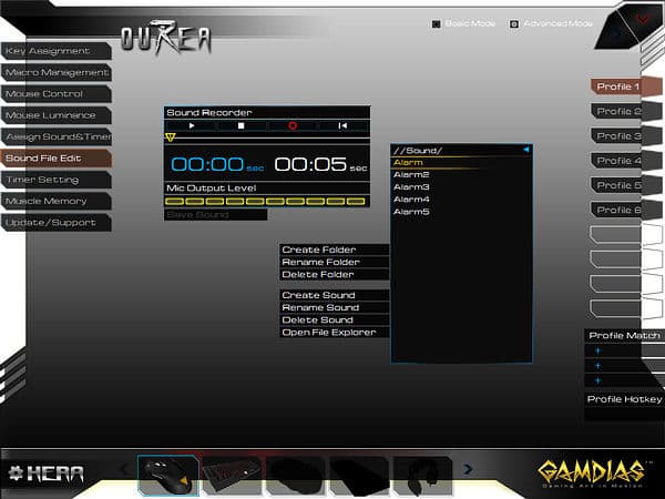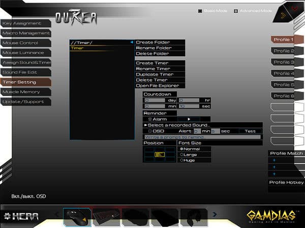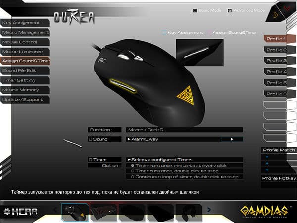 Оригинальной возможностью ПО от GAMDIAS является доступное в разделе «Assign Sound&Timer» назначение на любую кнопку однократного или продолжительного воспроизведения звуковых файлов или таймеров (также требует запуска HERA), опциональны перезапуск и прерывания по однократному и двукратному нажатиям.