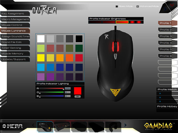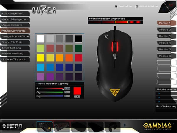 Подсветка настраивается в разделе «Mouse Luminance». Для каждого профиля (световой индикации разрешений не предусмотрено) можно выбрать произвольный цвет и настроить яркость (отключена, 50%, 100%, пульсирующая).