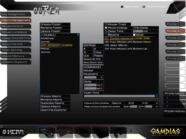 Вкладка «Macro Management» позволяет оперировать как с клавиатурой (сочетания с Windows-кнопкой обрабатываются корректно), так и с координатами курсора, возможна их установка вручную, поддерживаются запись и редактирование времени задержки при нажатии. Макрос может быть запущен один раз, определенное количество раз, продолжительно или продолжительно с прерыванием по нажатию любой кнопки.