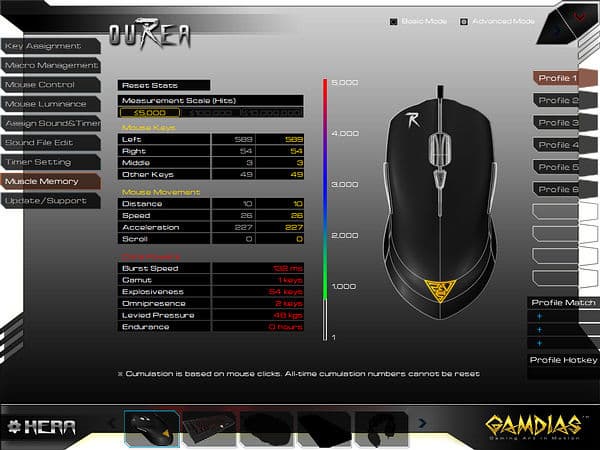 Вкладка «Muscle Memory» содержит статистику использования мыши, собираемую при запущенной программе HERA.