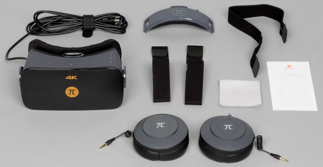 Сделанный из серого пластика корпус гарнитуры легко собирает отпечатки пальцев, поэтому довольно быстро начинает выглядеть грязным. На фронтальной части находится логотип компании в виде символа числа Pi (Пи). Чуть выше написано, что гарнитура поддерживает вывод изображения в разрешении 4K.