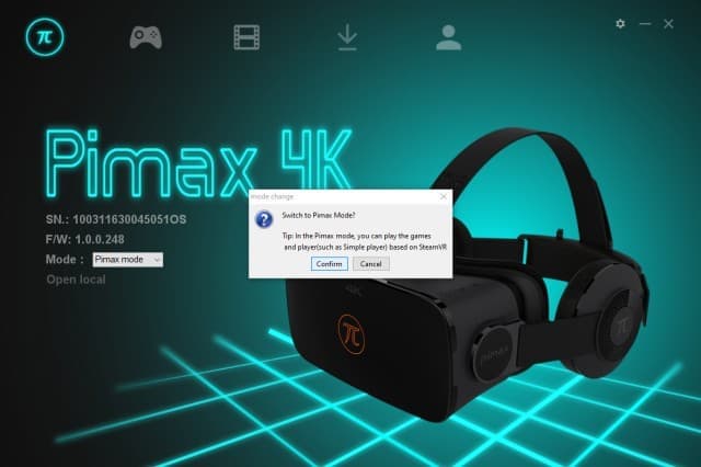 В режиме Pimax Mode пользователю доступен виртуальный экран с разрешением 2560×1440 (даже если физический монитор пользователя работает с разрешением 1920×1080). В этом режиме через библиотеку PiPlay доступны различные медиаформаты.