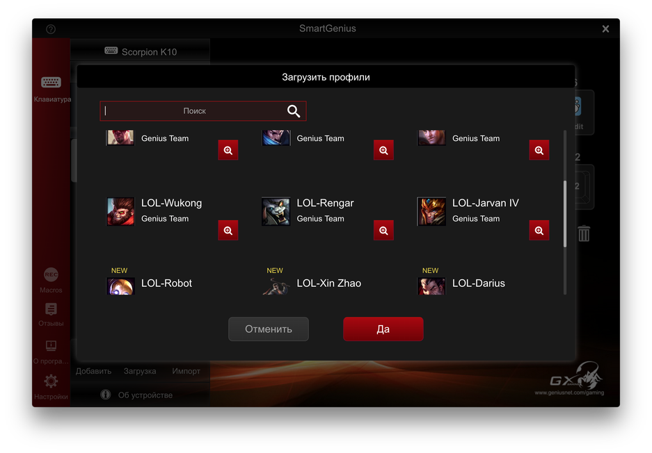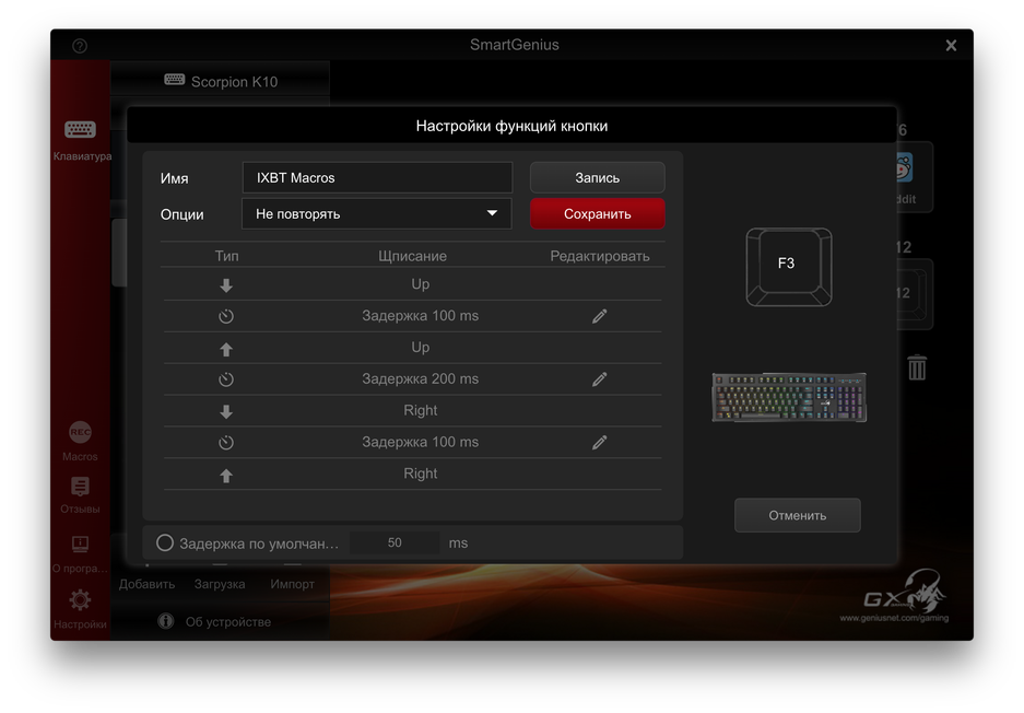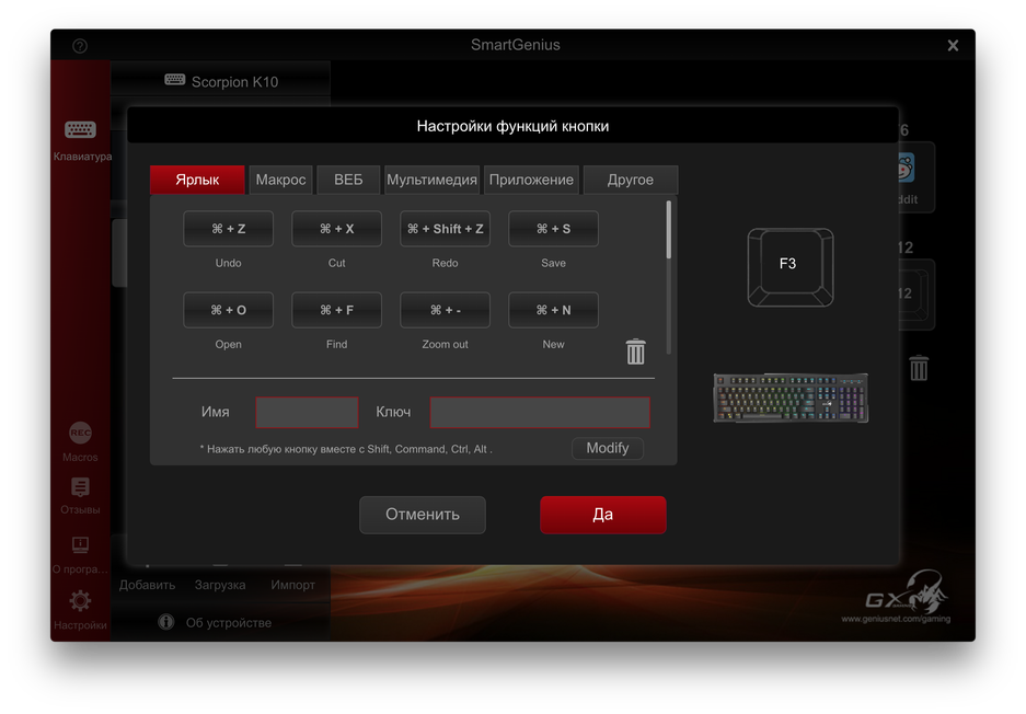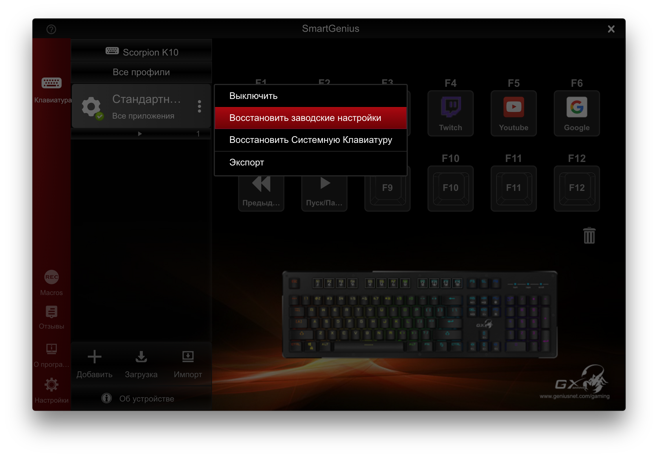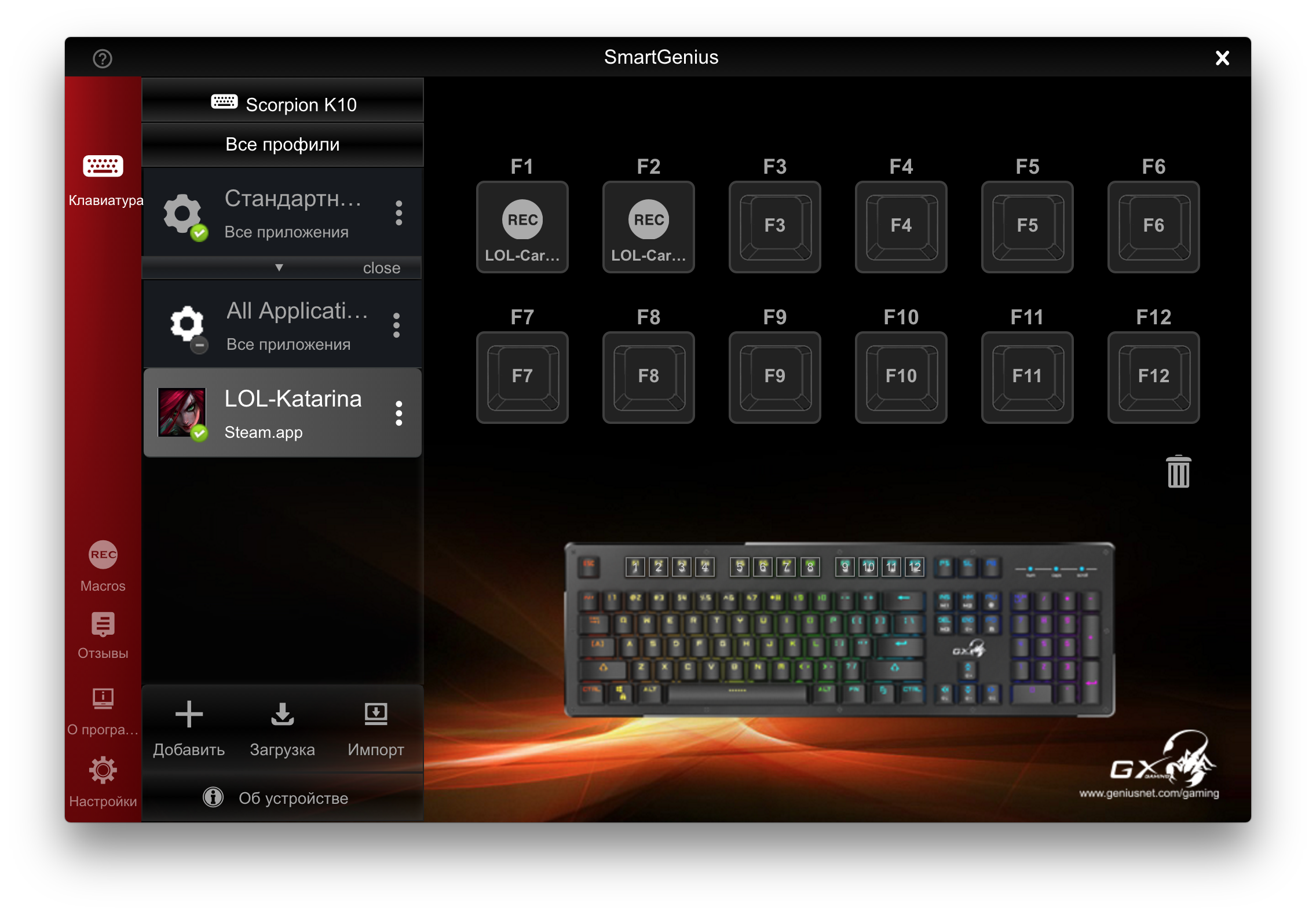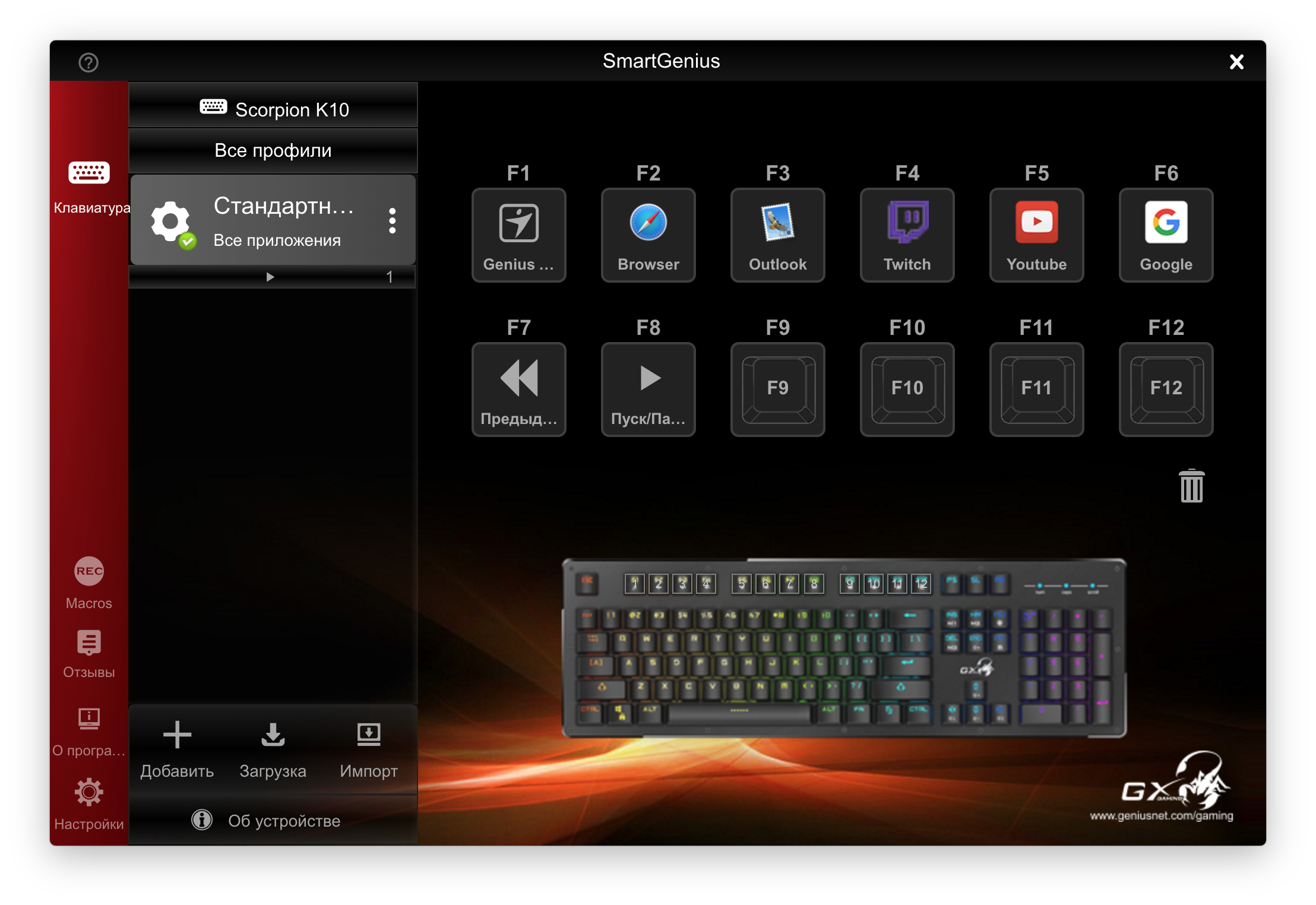 Прошли те счастливые времена, когда для победа над противником игроку приходилось днями учить сложные комбинации. Основное искусство в наше время — правильно и точно сконфигурировать макросы и иметь возможность их оперативно использовать. Genius Scorpion K10 и здесь не падает в грязь лицом — настройка различных функций доступна из под бесплатного приложения Smart Genius. Доступно, кстати, как на Windows, так и на Mac OS X, что, уж поверьте мне, в наше время редкость даже для не самых бюджетных игровых решений.