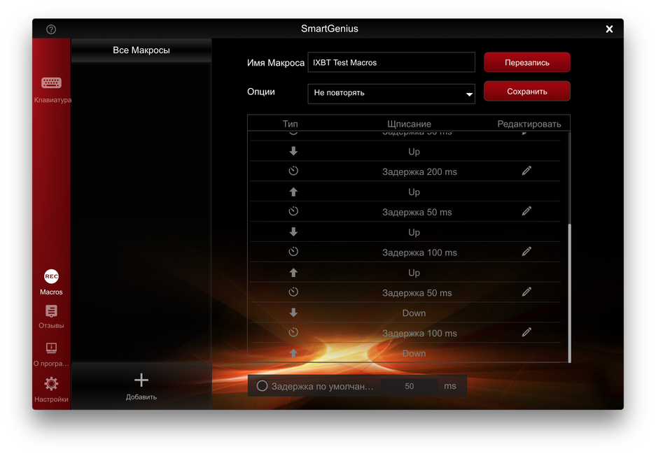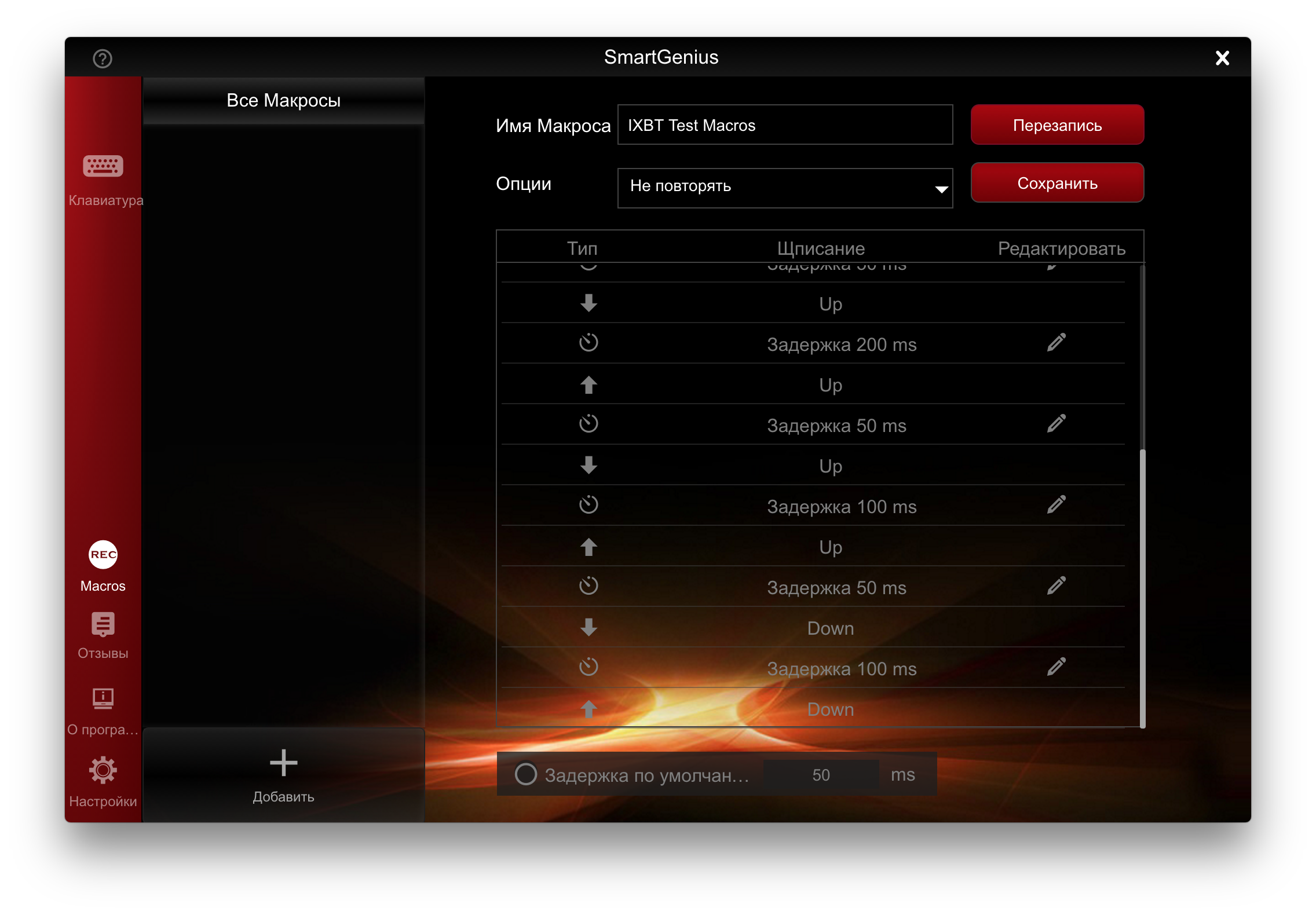 Раздел начался с размышлений о макросах — здесь их можно записывать как в отдельном разделе, так и в окне настройки каждой конкретной клавиши. В случае надобности макросы можно редактировать, изменяя их или глобально, или для каждой клавиши по отдельности. Более того — определённые наборы настроек могут привязываться к конкретному приложению, инактивируясь в другом, уступая место соответствующему паттерну. Если говорить о возможностях, связанных с макросами, кратко — они крайне гибкие.