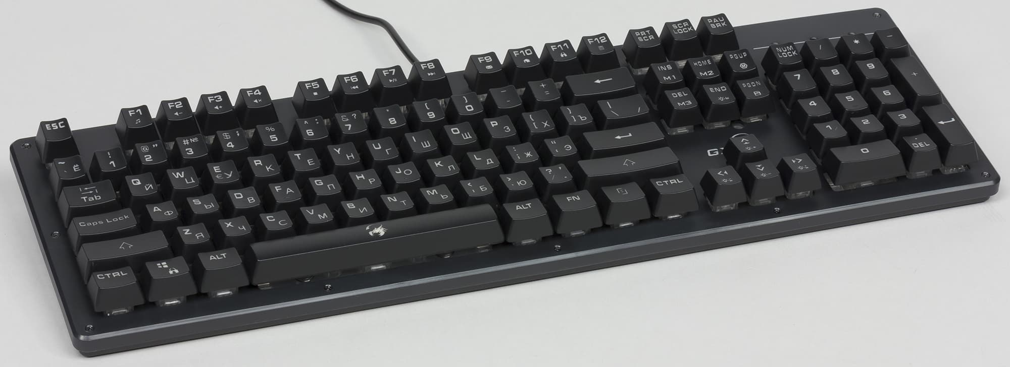 Клавиатура выполнена в привычном современному пользователю Skeleton-дизайне. Пластик основания матовый и шершавый. Пластик клавиш чуть более глянцевый, однако качество сцепления с пальцами пользователя от этого не страдает. Количество клавиш стандартное — 104, чего много лет хватало геймерам по всему миру, да и сейчас большинству хватает.