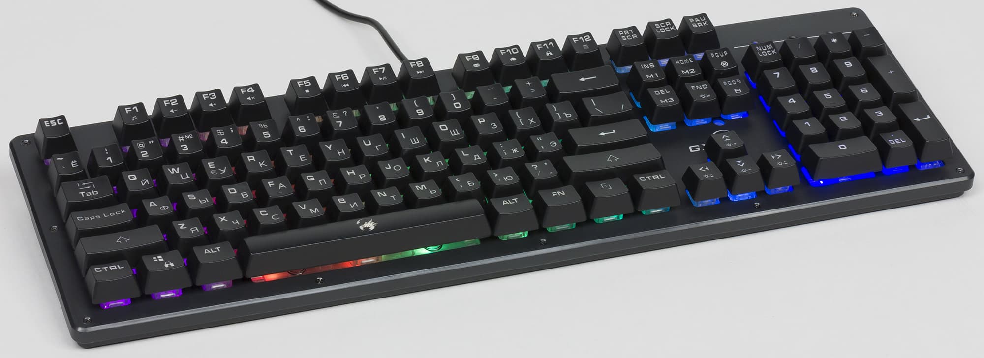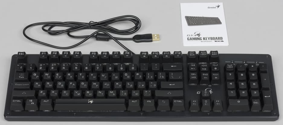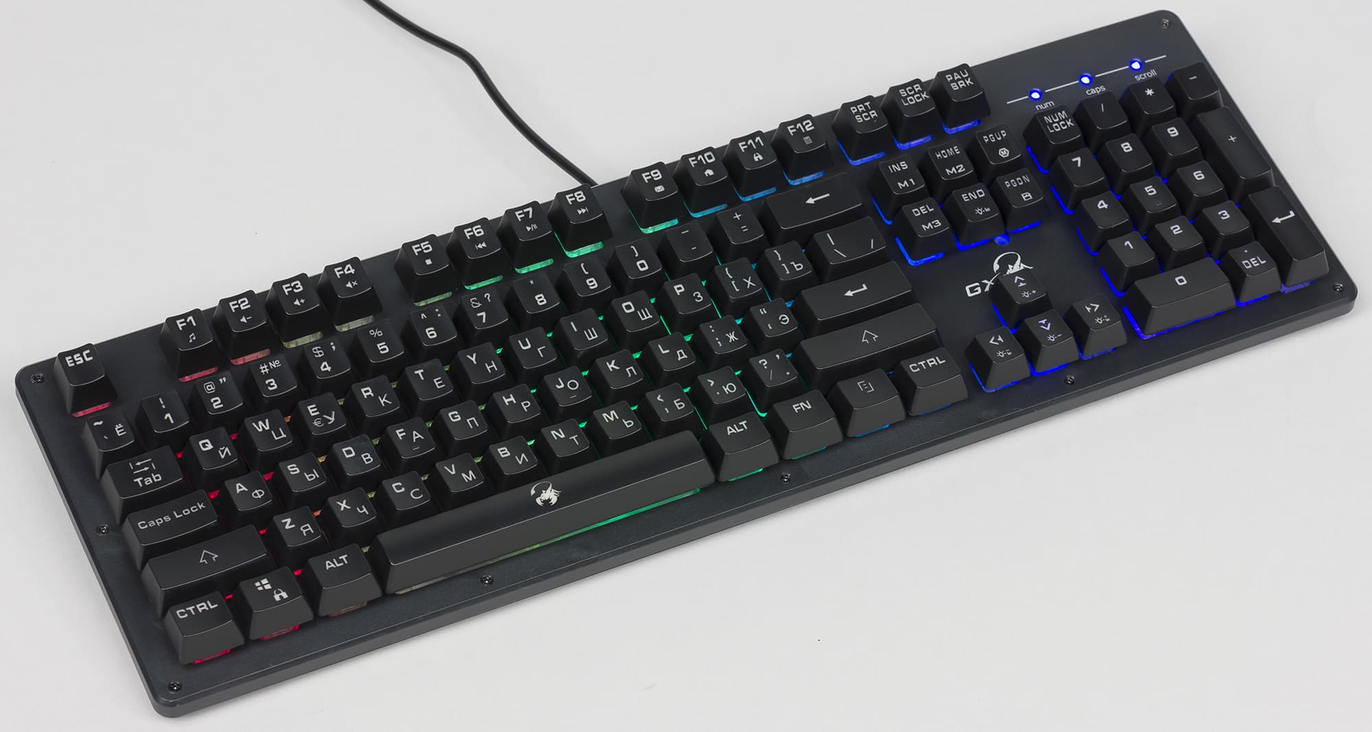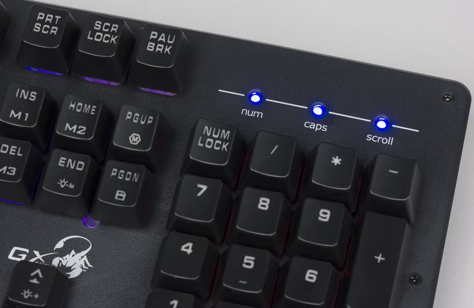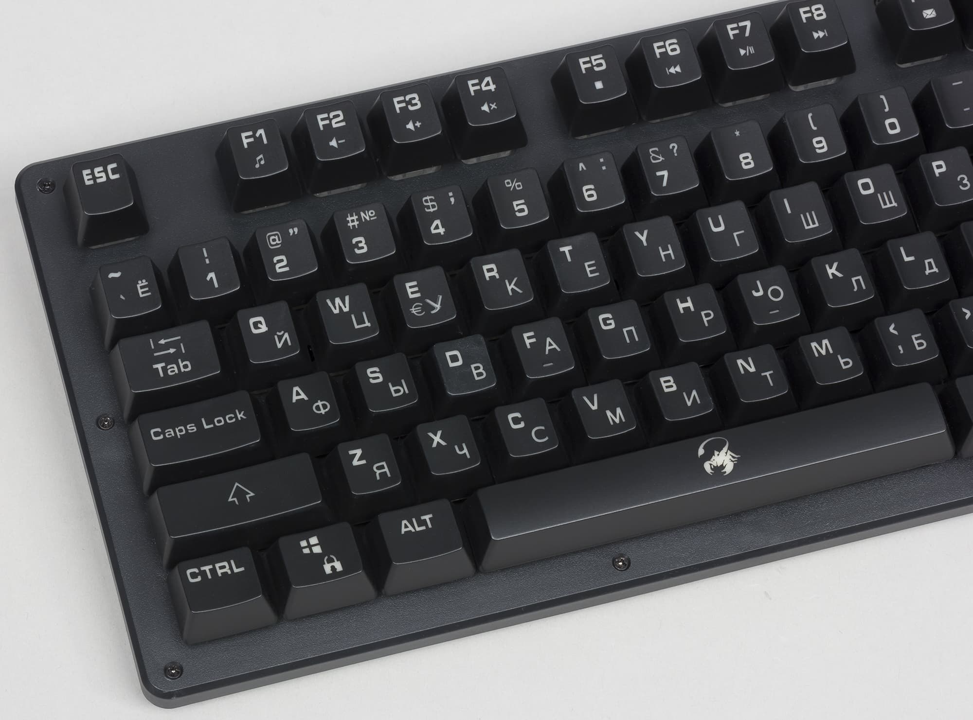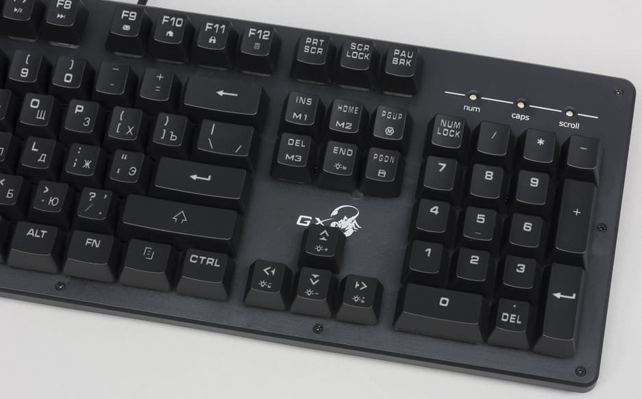 На клавише пробела расположен логотип серии Genius GX — скорпион. Справа от пробела есть функциональная клавиша, необходимая для клавиатурных сочетаний, отвечающих за смену режимов подсветки, запуск макросов и прочих расширенных функций. Слева — клавиша Windows с возможностью блокировки, что многие экспрессивные игроки наверняка одобрят.