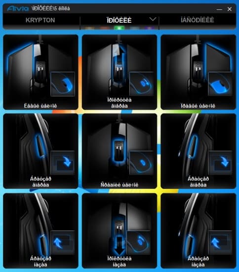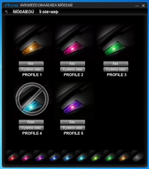 Окно программы состоит из трех вкладок. В первой мы можем выбрать продукт Aivia, перейти на форум этой линейки или сайт производителя. Во второй вкладке назначаются клавиши для пяти профилей: цветовой индикатор вверху синхронизирован с мышкой.