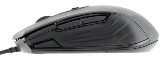 Боковые поверхности мыши абсолютно симметричны и почти полностью прорезинены. С каждой стороны имеется пара крупных кнопок для большого пальца и клавиша переключения профилей.