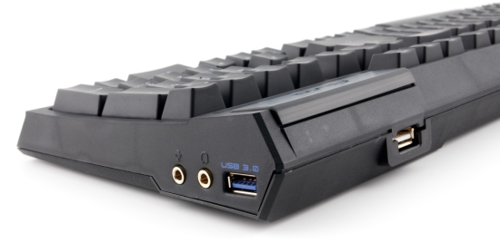 Левый борт Osmium украшен серебристым логотипом Ghost Macro Engine. На правом находятся разъемы расширения: USB 3.0, Audio In и Audio Out. Другой разъем USB, уже второй версии, расположен на тыльной стороне. Он может работать и без дополнительного USB-подключения, через основной кабель, соединяющий с компьютером саму клавиатуру.