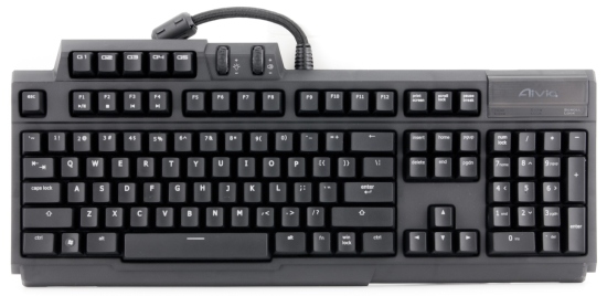 При взгляде на дополнительные элементы управления создается впечатление, что производитель пытался сэкономить место. Мультимедийный блок совмещен с клавишами F1-F4: для управления плеером придется занять обе руки. Пять макроклавиш вынесены на маленький полуостров вместе с неширокими прорезиненными колесиками для регулировки уровней звука и подсветки. Но самое интересное — это логотип Aivia. Металлическая вставка, на которой расположен он и трио индикаторов, является одновременно и кнопкой переключения профилей. Соответственно профилю изменяется цвет надписи.