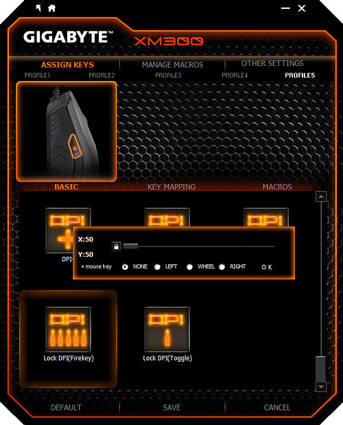 Кроме основных кнопок и кнопки-колеса Gigabyte XM300 оснащена четырьмя дополнительными кнопками — двумя боковыми на левой стороне и двумя в верхней части за колесом, по умолчанию переключающими разрешение. Соответствующий четырехпозиционный светодиодный индикатор находится рядом с боковыми кнопками.
