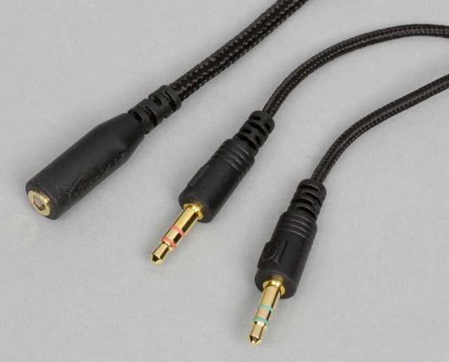 Кабель в данной гарнитуре несъёмный и подключается к левой чашке. На выходе есть муфта для защиты от перегиба. Длина кабеля составляет 1,3 метра. Он достаточно толстый, но мягкий, в частности из-за наличия тканевой оплетки. На конце находится стандартный тонкий штекер 3,5 мм, реализованный по стандарту CTIA (LRGM). Он подойдет для прямого подключения к игровым консолям (точнее их контроллерам), а также многим смартфонам.