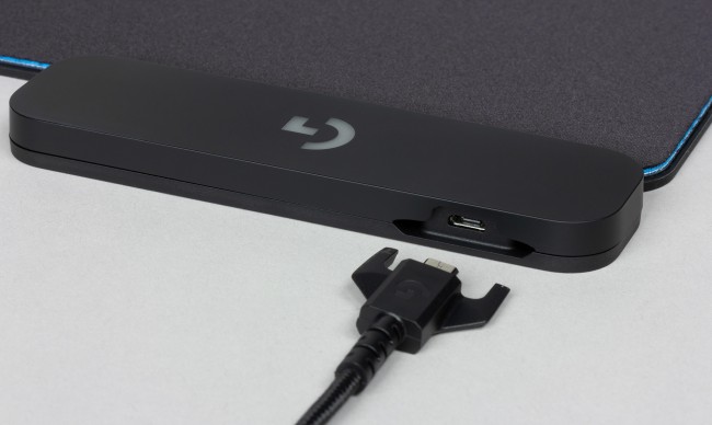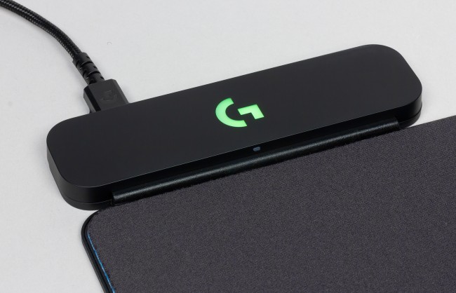 К левому верхнему углу присоединён модуль управления со встроенной электроникой, реализующую, в частности, поддержку технологии Lightspeed. Таким образом, при подключении коврика к ПК беспроводная периферия, в нашем случае манипулятор G502 Lightspeed, будет работать через ресивер радиосигнала в модуле управления Powerplay.