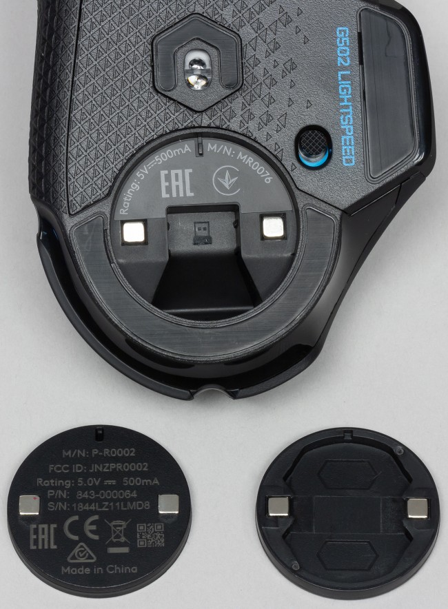 Если слегка приложить усилие к кромке ложа для большого пальца, то можно отделить крышку внутреннего отсека, удерживаемую магнитом. Это отсек для установки четырёх утяжеляющих пластин массой по 2 г каждая. Ещё два места для пластин по 4 г предусмотрено в круглой крышке с логотипов в виде буквы G.