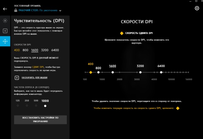 Крайним из списка открывается меню настроек чувствительности мыши.
