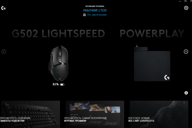 Для настройки мыши и режимов работы подсветки доступно фирменное приложение G Hub. Мы использовали версию 2019.5. На домашнем экране G Hub можно выбрать подключённое устройство для настройки.