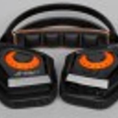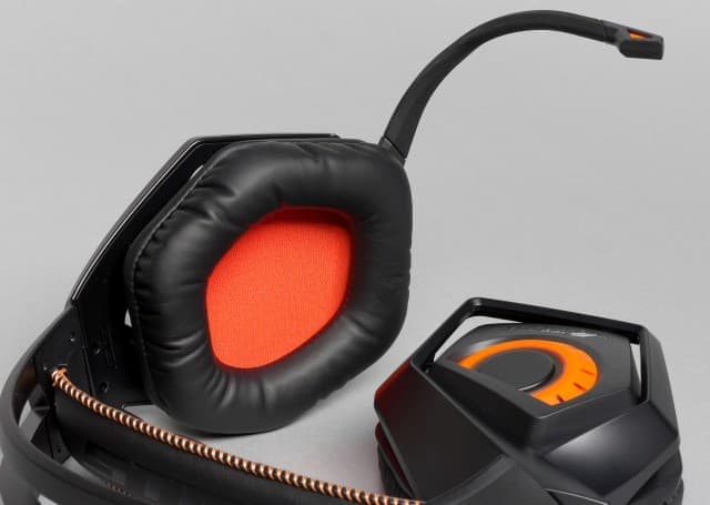 Амбушюры гарнитуры сделаны из приятной на ощупь, мягкой синтетической кожи черного цвета, что обеспечивает плотное и комфортное прилегание к голове, создавая неплохую звукоизоляцию. Динамики диаметром 60 мм прикрыты мягкой красной звукопроницаемой материей.