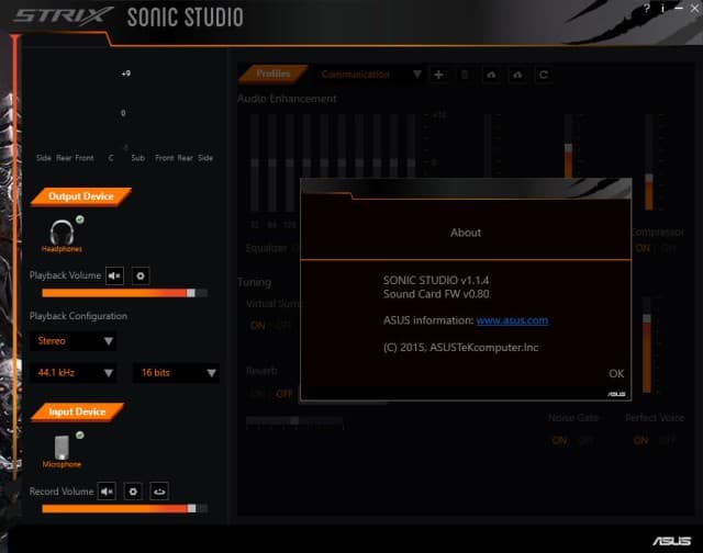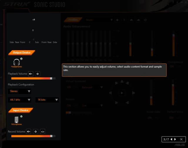 Компания Asus предлагает на своем сайте скачать фирменное приложение для гарнитуры Strix Wireless. Фирменное приложение Strix Sonic Studio (SSS) оформлено просто и понятно, но, если возникнут затруднения, всегда можно кликнуть по знаку вопроса в правом верхнем углу окна утилиты и получить помощь.